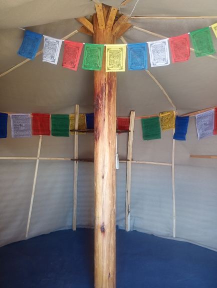 Una estructura circular de 8 metros de diámetro. Una versión adaptada de una yurta mongola, construida sobre una sólida base de hormigón y troncos de pino envueltos con lonas.